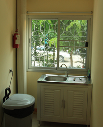 -Kitchen with kettles, zinc, refrigerator and a cupboard